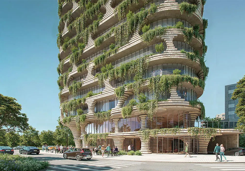 Edificio de 32 pisos Una torre que desdibuja la frontera entre la naturaleza y la arquitectura, expresando el paisaje natural dentro del entorno urbano.