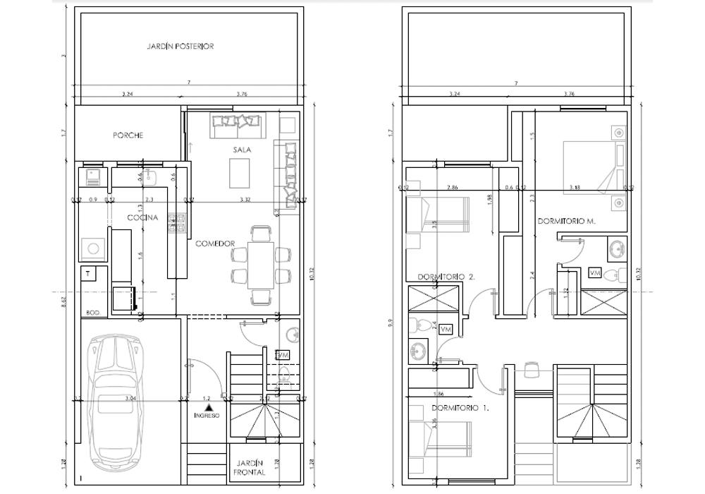 Amplia casa de 116.37 metros de construcción, cuenta con tres habitaciones con modernos acabados y acceso a dos espacios de parqueo y bodega.